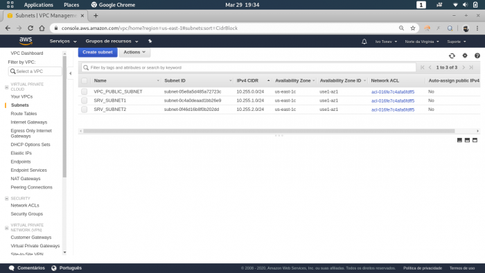3 – Clique no menu de “Subnets” para criar as redes privadas. Já vai aparecer a “VPC_PUBLIC_SUBNET” como disponível:
