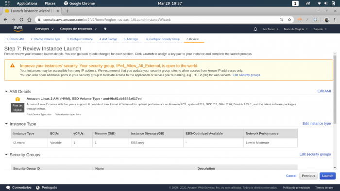 35 – Escolha o grupo de segurança que criamos. Ele vai permitir todo o trafego de entrada e saída. Ao finalizar, clique no “Review and Launch”:
