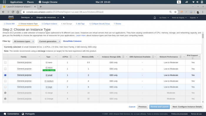 20 – Deixe o tipo em “t2.micro” e clique no “Next: Configure Instance Details”
