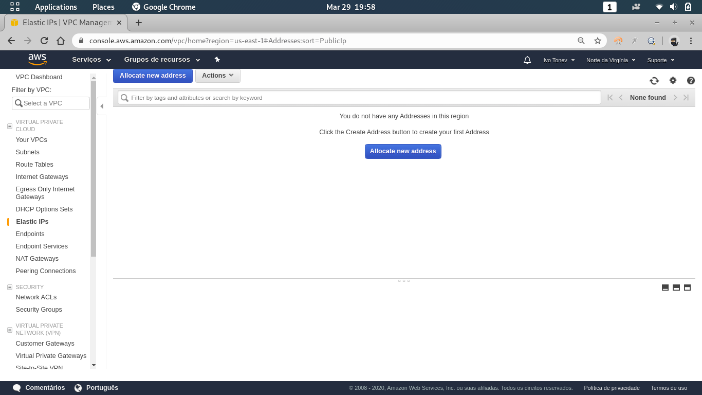 60 – Volte no console da AWS na opção de “VPC” e entre no menu de “Elastic IPs”. Clique no botão “Allocate new address”:
